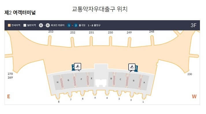 해당자격은 만 70세 이상, 만 7세 미만, 장애인, 임산부, 병약 승객, 사회적 기여자이며 필요한 증빙서류를 준비해야 합니다. 이용 대상자와 동반인만 항공사 체크인 시 우대스티커를 발급받아 이용하며 다른 동반인 들은 우대 출국 입구에서 여권이나 우대카드를 제시 후 이용합니다. 제1 터미널과 제2 터미널의 각 출국장별 운영시간과 게이트가 다르니 확인하고 이용하도록 합니다.