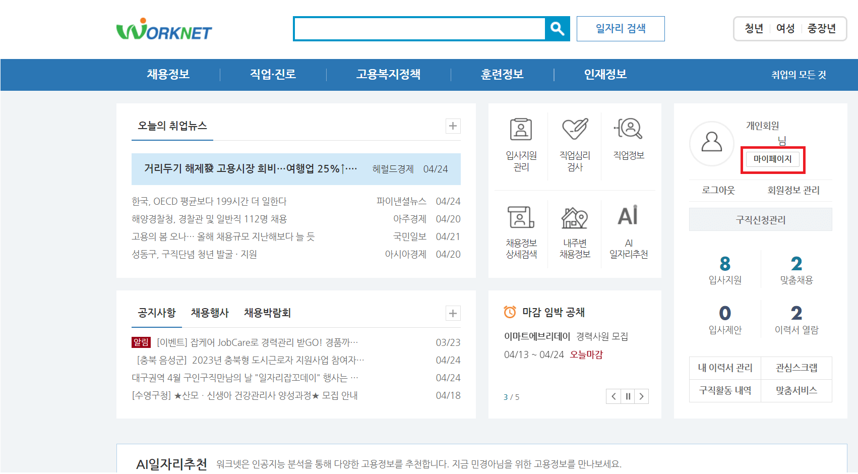 워크넷 사이트 : https://www.work.go.kr/seekWantedMain.do
