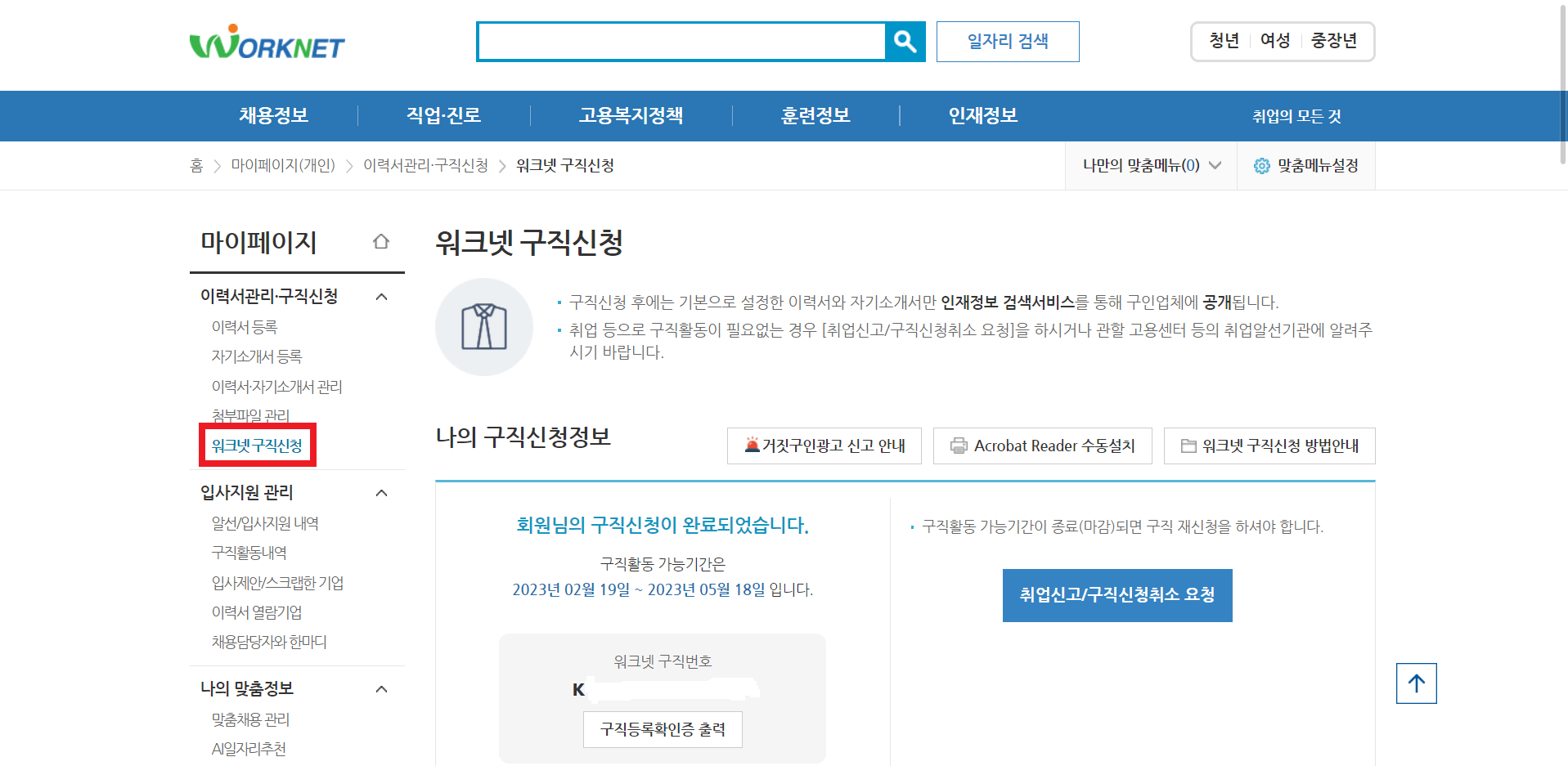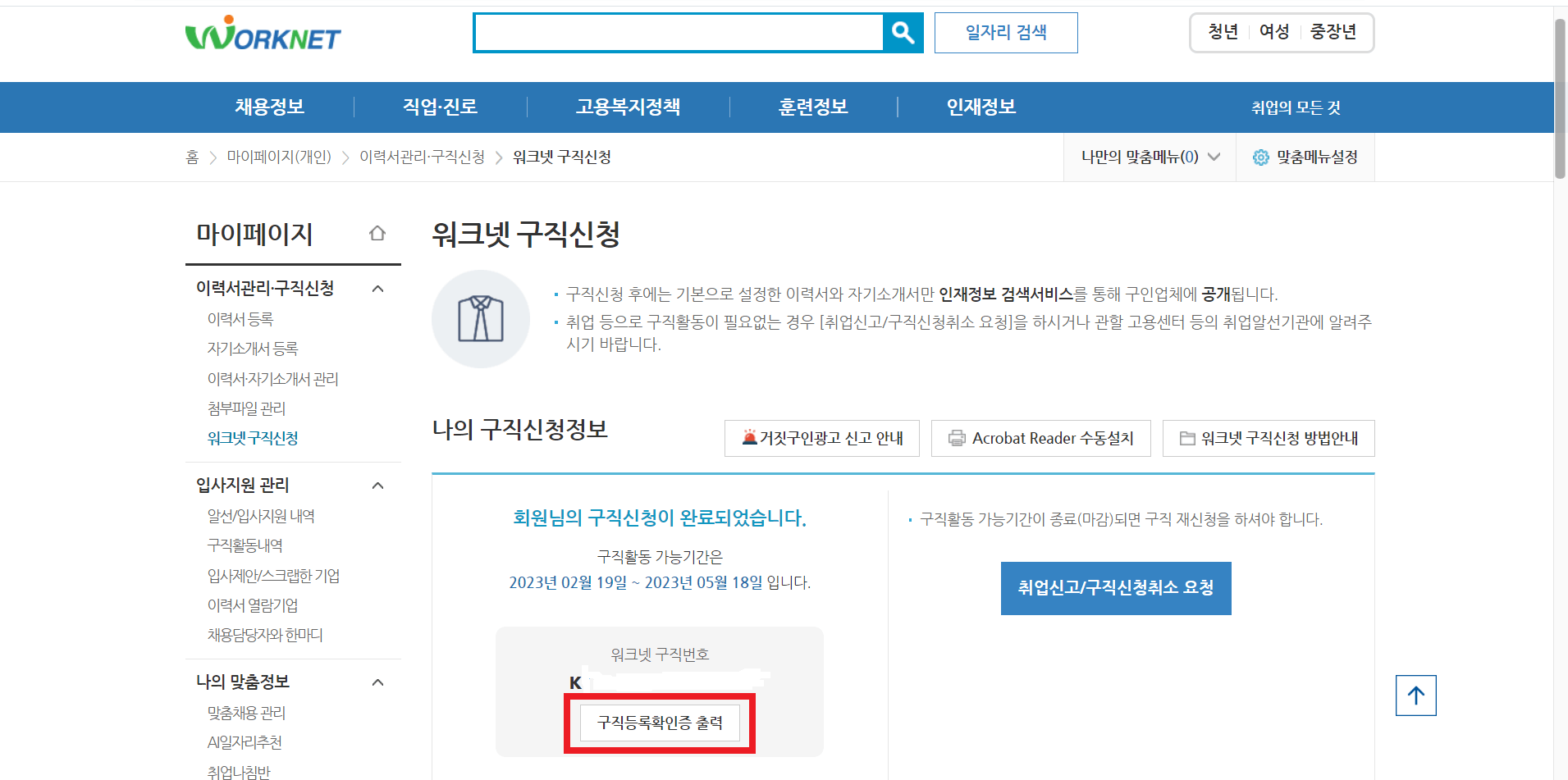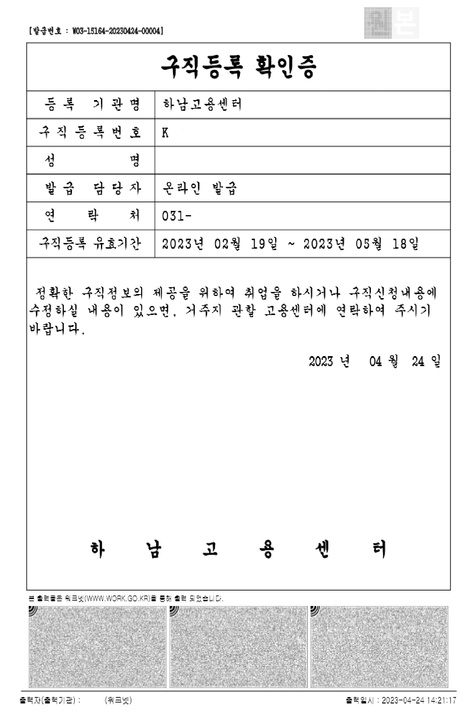 구직신청을 하고 나면 구직등록 확인증을 출력하실 수 있습니다.