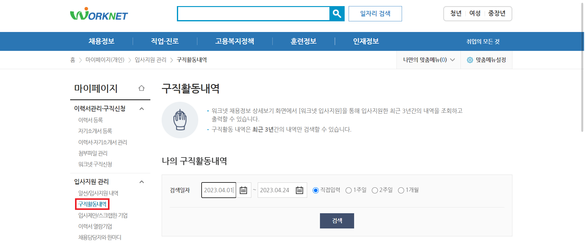 마이페이지 - 이력서 관리 · 구직신청에서 구직활동내역을 클릭한 후 나의 구직활동내역에서 검색일자를 설정하고 검색을 누릅니다.