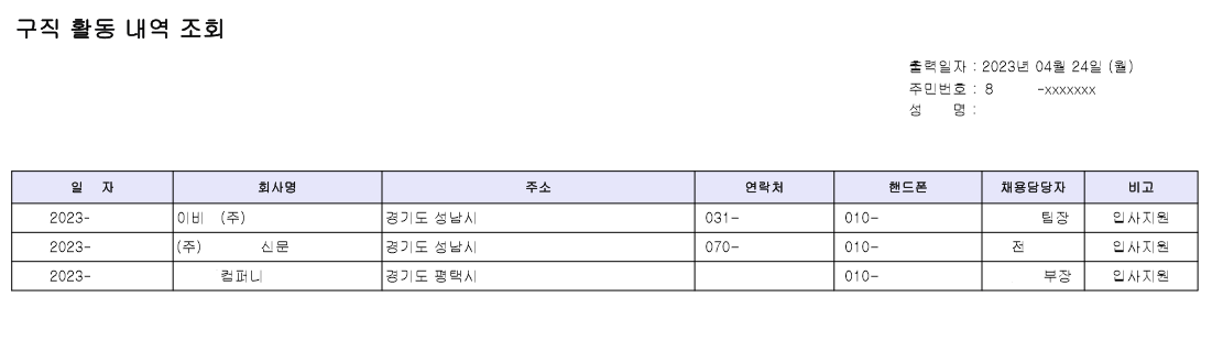 구직 활동 내역 조회 하단에 있는 인쇄를 눌러 출력하실 수 있습니다.