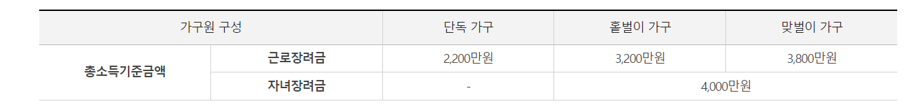 2022년 근로소득, 사업소득(전문직 제외) 또는 종교인소득이 있는 가구로서 아래의 요건을 모두 충족하는 경우에 신청할 수 있습니다. 단 심사결과에 따라 신청요건을 충족하지 못한 경우 지급제외 또는 감액될 수 있습니다.